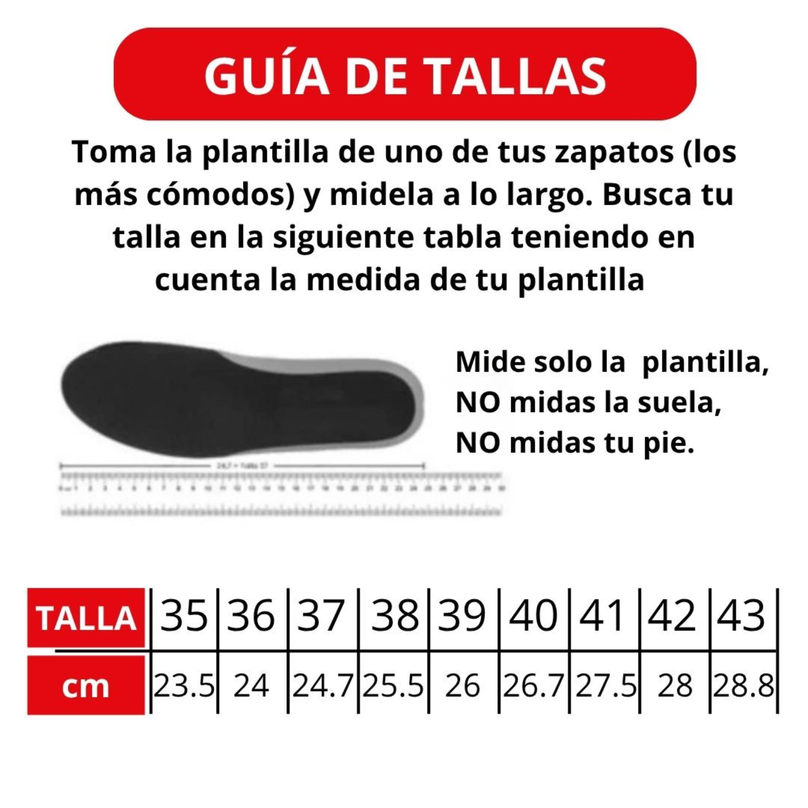 ¡Queremos que tus nuevos zapatos te queden como un guante! Por eso, te invitamos a revisar nuestra guía de tallas que damos en cada producto para encontrar tu número perfecto. Y si al recibirlos no te quedan bien, ¡no hay problema! Nuestra política de devoluciones te permite cambiarlos sin complicaciones.